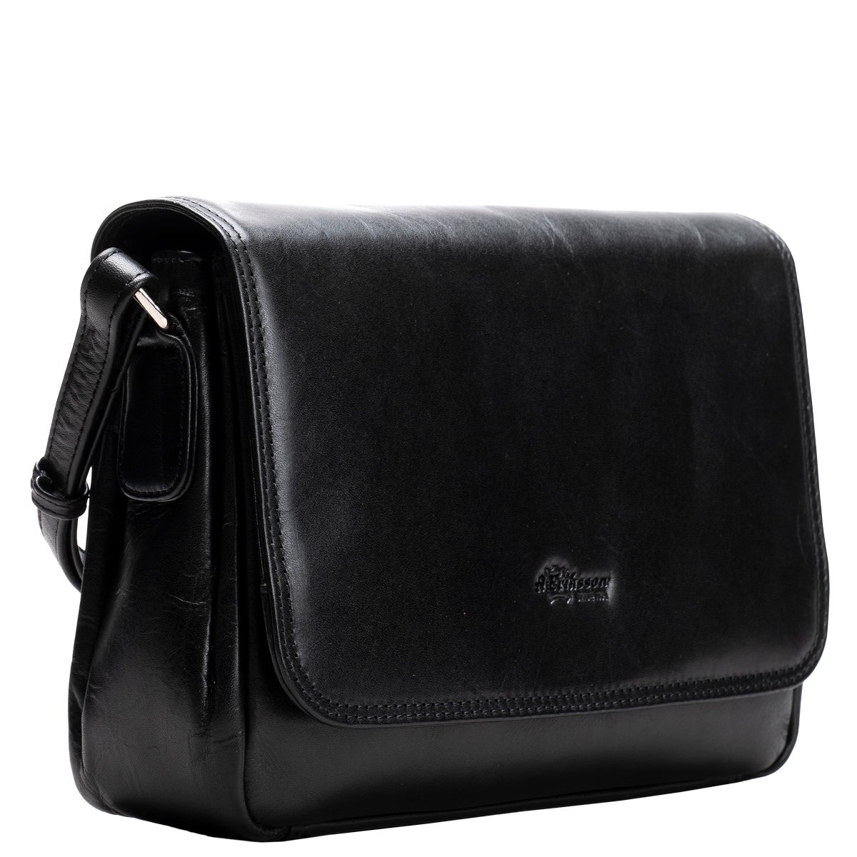 A. Erikssonin Eckerö-malliston monipuolinen läpällinen Eva-nahkalaukku. Kompaktissa laukussa on magneettikiinnitteisen läpän alla kolme lokeroa joista keskimmäinen on vetoketjulla suljettava ja siellä sisällä vielä pieni vetoketjutasku, puhelintasku sekä pari kynäpaikkaa. Takapuolella vielä vetoketjullinen tasku. Portaattomasti säädettävä olkahihna 70-140 cm. Mitat 23 x 17 x 7 cm.