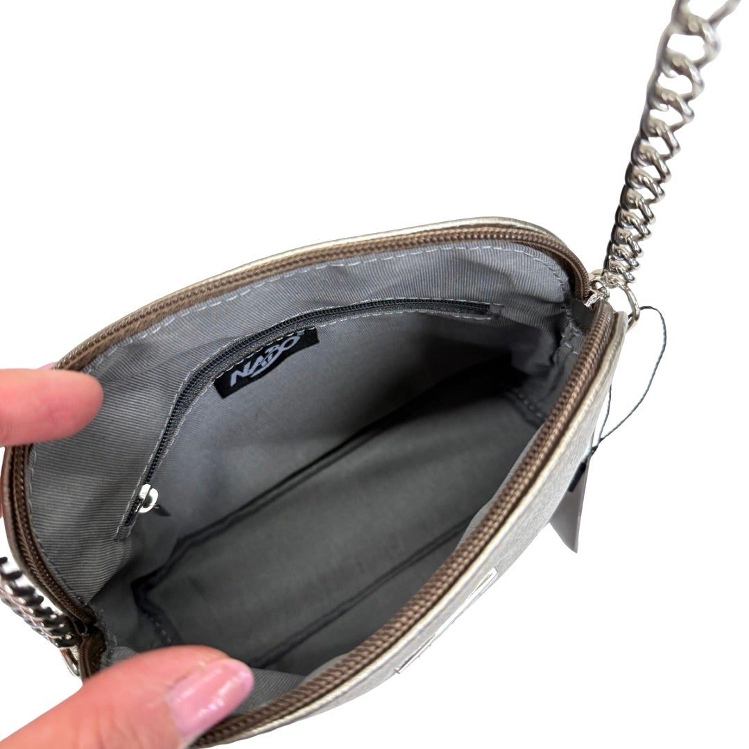 Nabon kaunis olkalaukku. Sopii arkeen ja juhlaan! Säädettävässä olkahihnassa ketjukoristeet molemmilla puolilla. Ulkopuolella vetoketjutasku. Suljetaan vetoketjulla ja laukun sisäpuolella pieni vetoketjutasku.