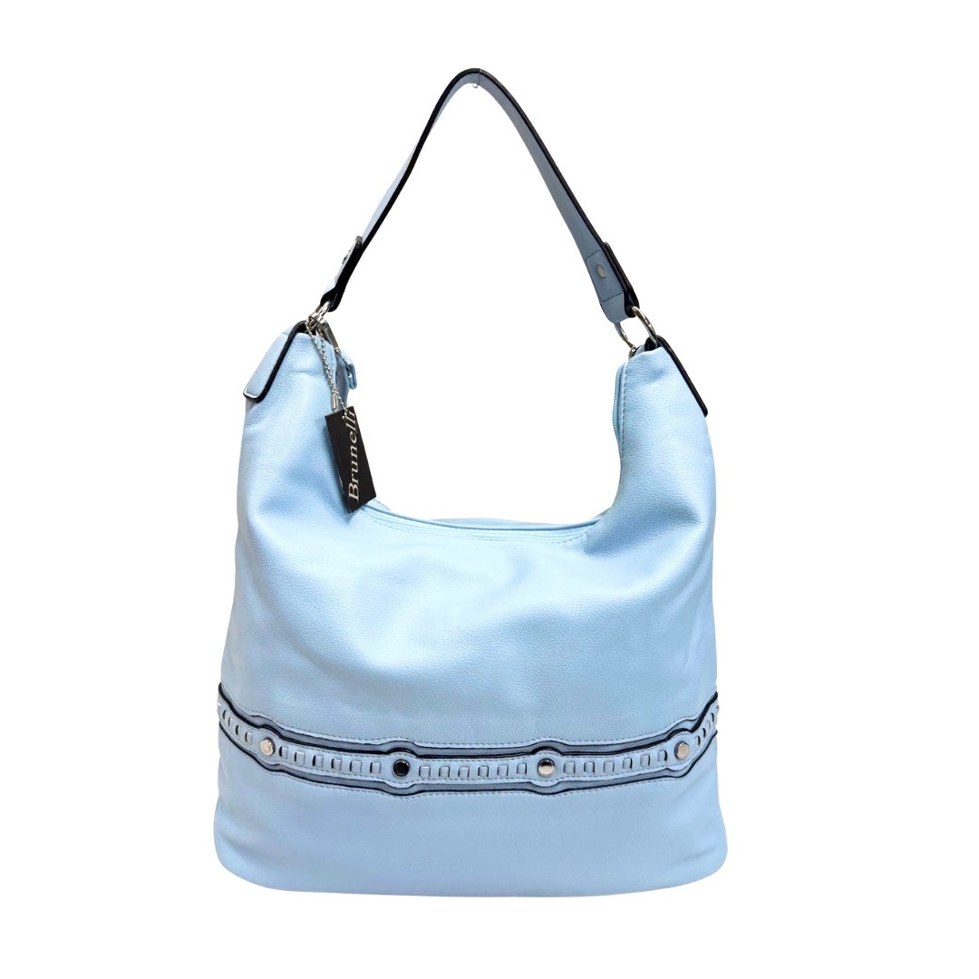 Iso keinonahkalaukku, jossa kaunis koristetikkaus ja niitit edessä. Laukussa on kiinteä kantokahva sekä irrotettava ja säädettävä olkahihna. Laukun takapuolella vetoketjutasku. Laukku suljetaan vetoketjulla. Laukun sisällä ruskea kangas vuori. Laukussa kaksi osiota, joiden välissä iso vetoketjutasku. Sisällä lisäksi pieni vetoketjutasku ja avoin pikkutasku. Koko n. 28x35x15cm
