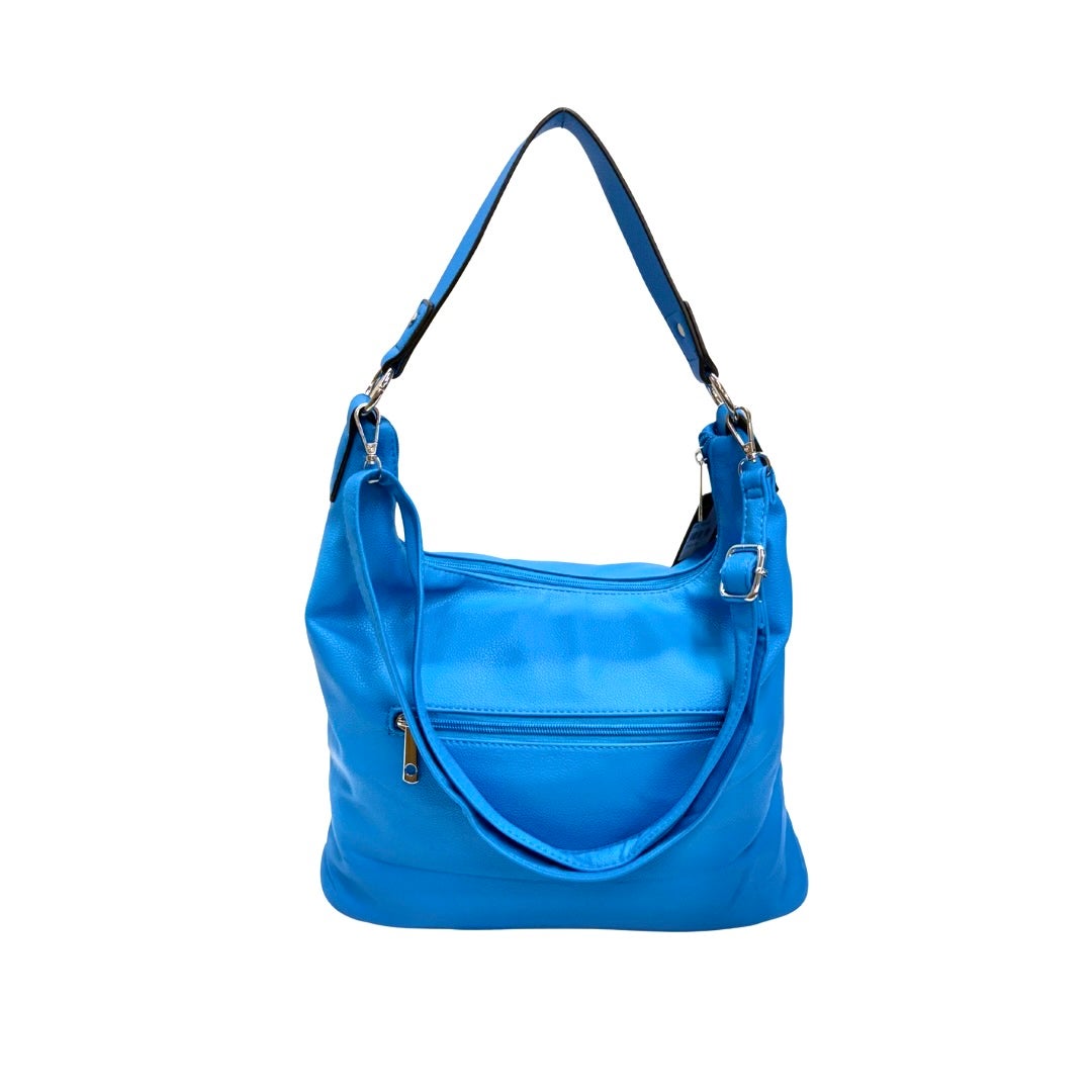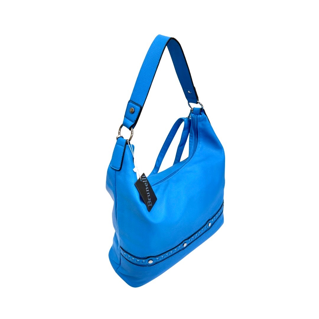 Iso keinonahkalaukku, jossa kaunis koristetikkaus ja niitit edessä. Laukussa on kiinteä kantokahva sekä irrotettava ja säädettävä olkahihna. Laukun takapuolella vetoketjutasku. Laukku suljetaan vetoketjulla. Laukun sisällä ruskea kangas vuori. Laukussa kaksi osiota, joiden välissä iso vetoketjutasku. Sisällä lisäksi pieni vetoketjutasku ja avoin pikkutasku. Koko n. 28x35x15cm