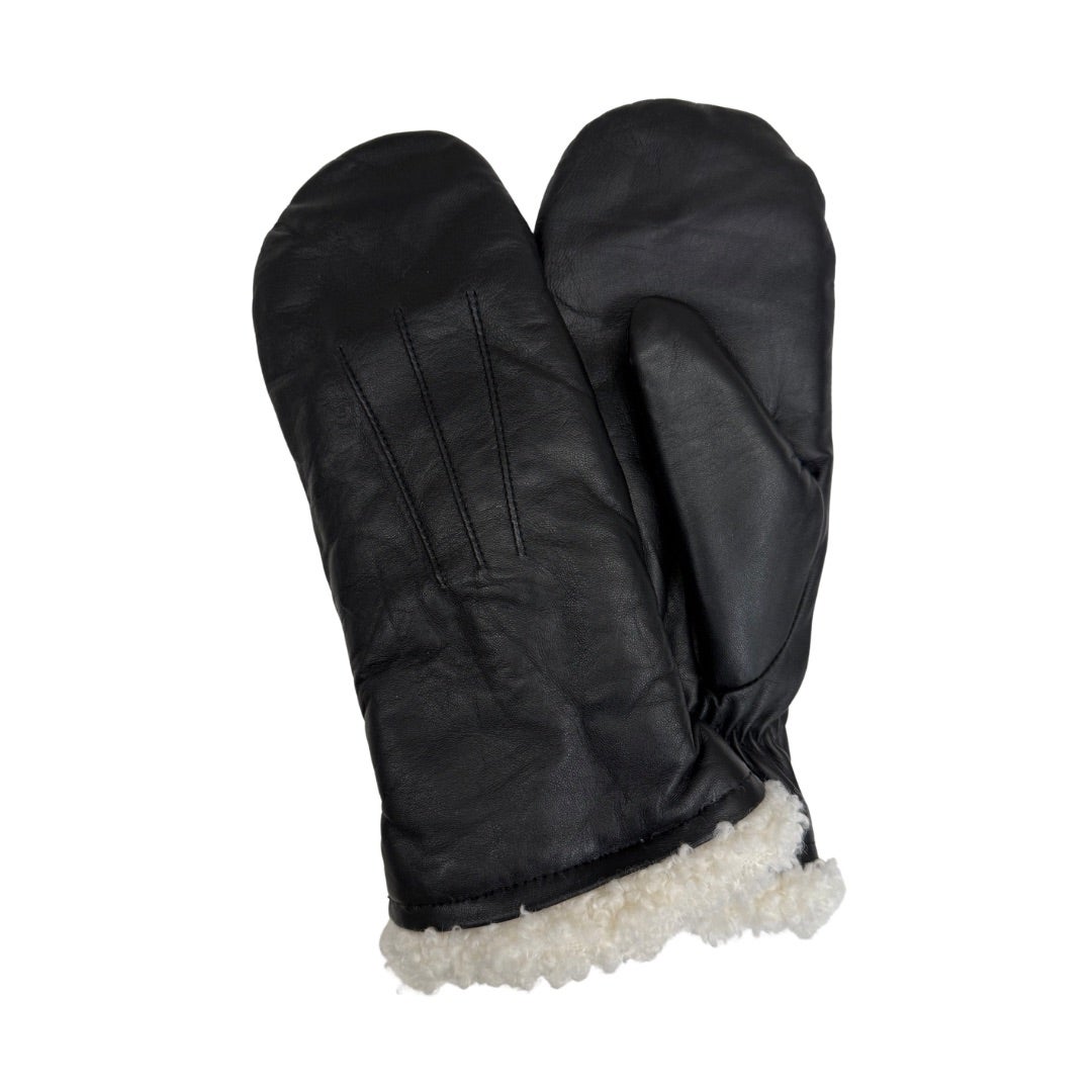 Naisten nahkakinnas pörröisellä vuorella. 100% lampaannahkaa ja vuori 100% polyesteriä.