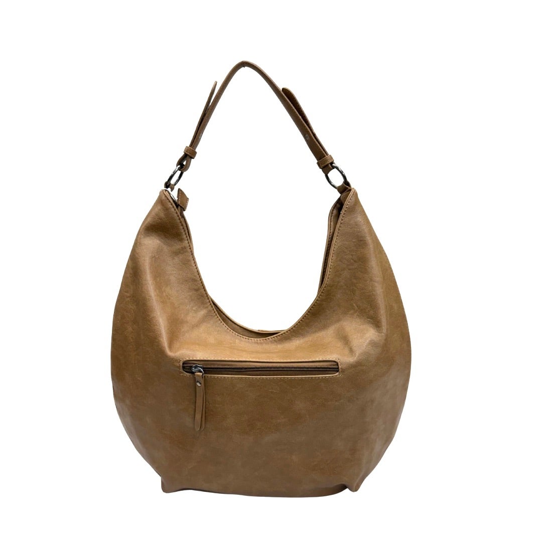 Trendikäs iso keinonahkalaukku, jossa lyhyt kantohihna, jota pystyy säätäämään portaittain. Pehmeää materiaalia. Laukku suljetaan vetoketjulla. Laukun ulkopuolella vetoketjutasku. Sisällä vaalea kangasvuori, kaksi pikkutaskua sekä vetoketjullinen pikkutasku. Koko n. 40x32x7cm