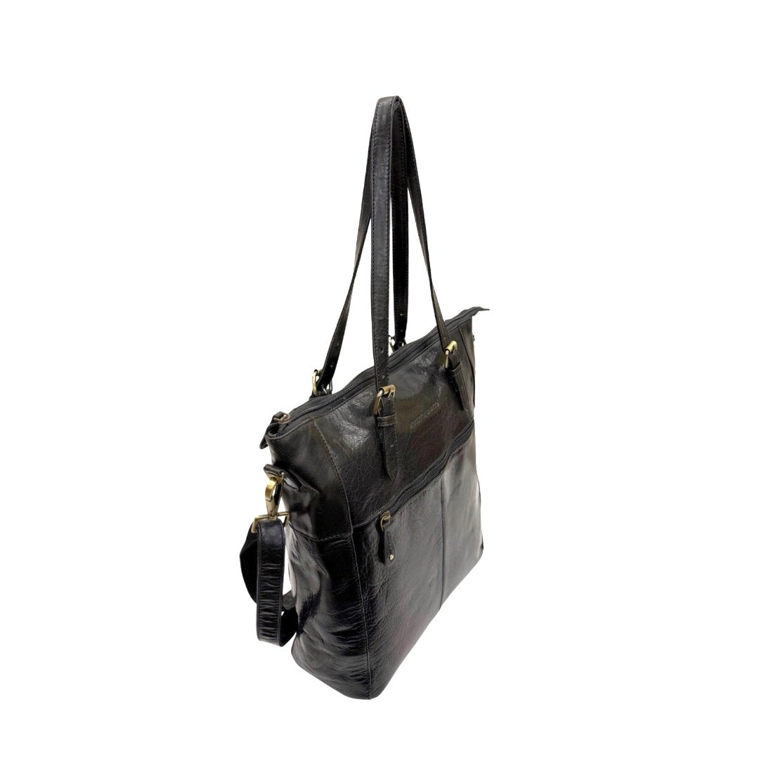 Upea nahkalaukku, johon mahtuu kaikki tarvitsemasi. Laukun etu- ja takapuolella vetoketjutaskut. Kaksi kantokahvaa ja irrotettava sekä säädettävä olkahihna. Laukku suljetaan vetoketjulla ja sisällä läppäritasku pienelle läppärille tai papereille ja muita pikkutaskuja. Laukun keskiosaan mahtuu helposti isompikin läppäri. Laukun koko n. 35x30x12cm