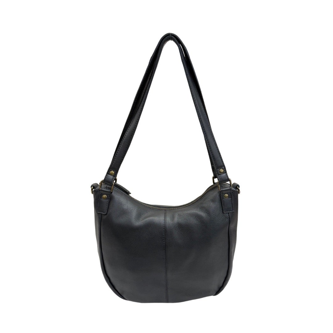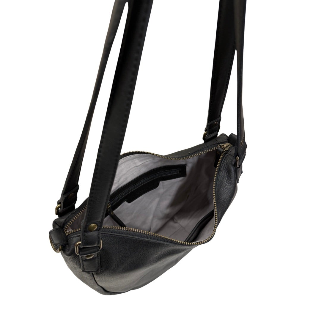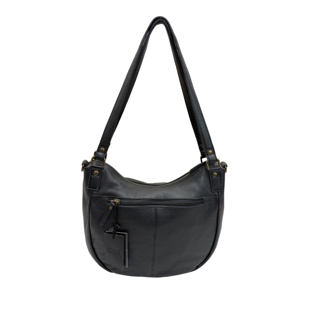 Tyylikäs mattapintainen nahkalaukku, jossa kaksi kiinteää kantokahvaa ja irrotettava, portaattomasti säädettävä olkahihna (77-130cm). Laukun ulkopuolella vetoketjutasku. Sisällä nahkalaukussa vaalea kangasvuori, kaksi avointa pikkutaskua sekä vetoketjutasku. Laukku suljetaan vetoketjulla.