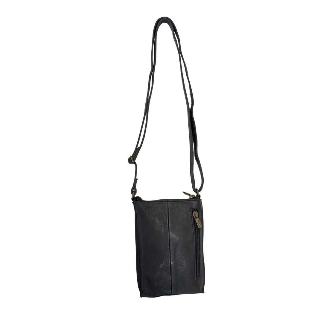 Tyylikäs kännykkälaukku nahkaa. Ohut portaattomasti säädettävä nahkahihna. Laukun toisella puolella vetoketjutasku ja toisella puolella magneettikiinnitteinen tasku. Laukku suljetaan vetoketjulla. Laukun koko n. 18x13x3cm