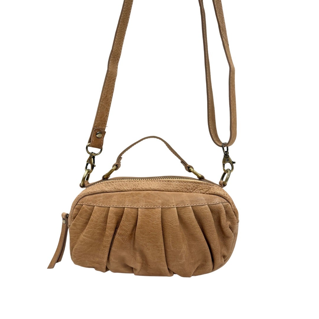 Kaunis pikkulaukku, jossa pitkä säädettävä olkahihna ja pieni kantohihna. Laukussa myös hihna vyötä varten, jolloin laukusta saa muutettua vyölaukun. Suljetaan vetoketjulla ja laukun sisällä korttikotelo, avainnauha ja vetoketjullinen tasku. Koko n. 12x21x5cm