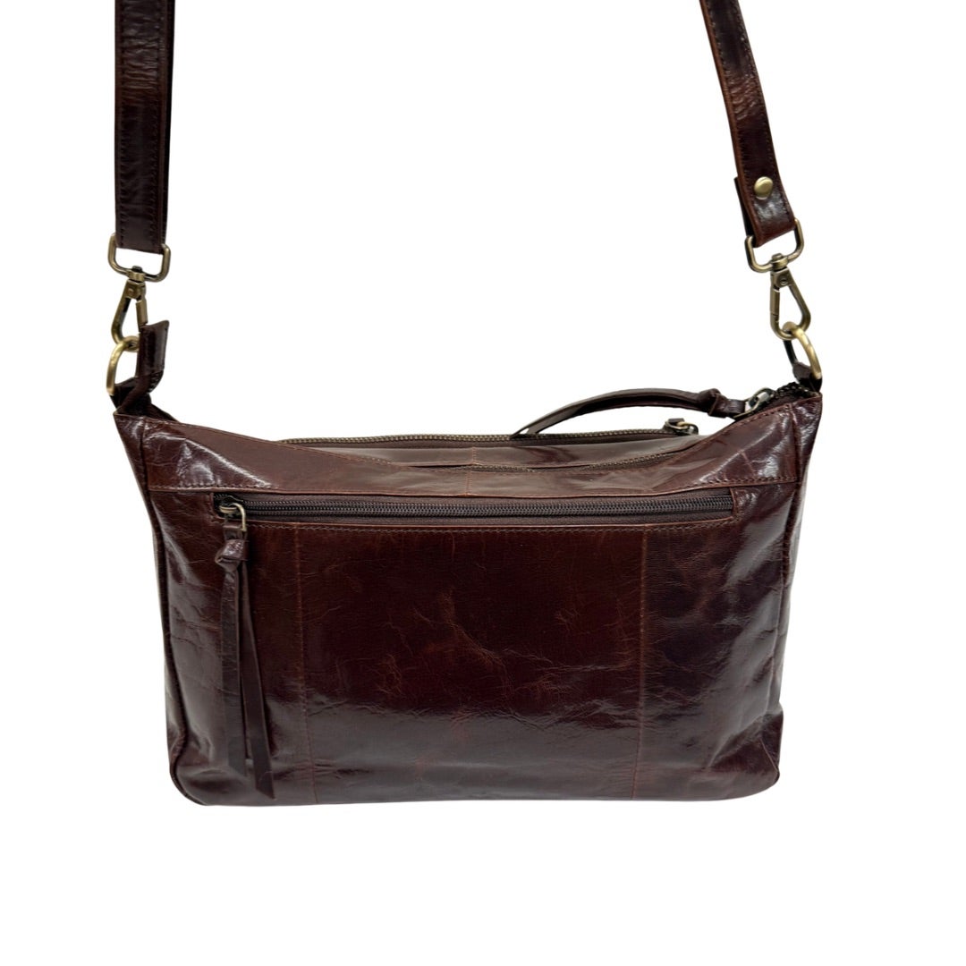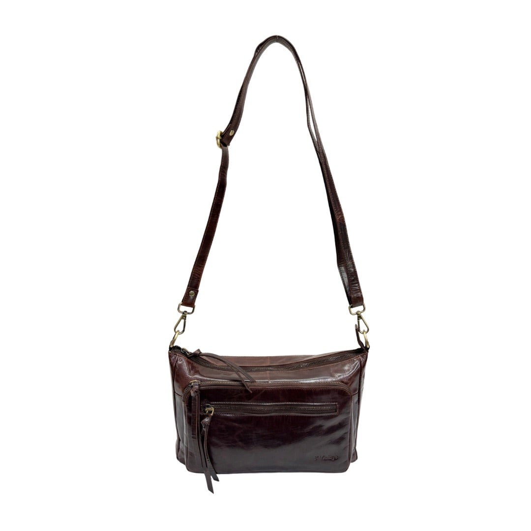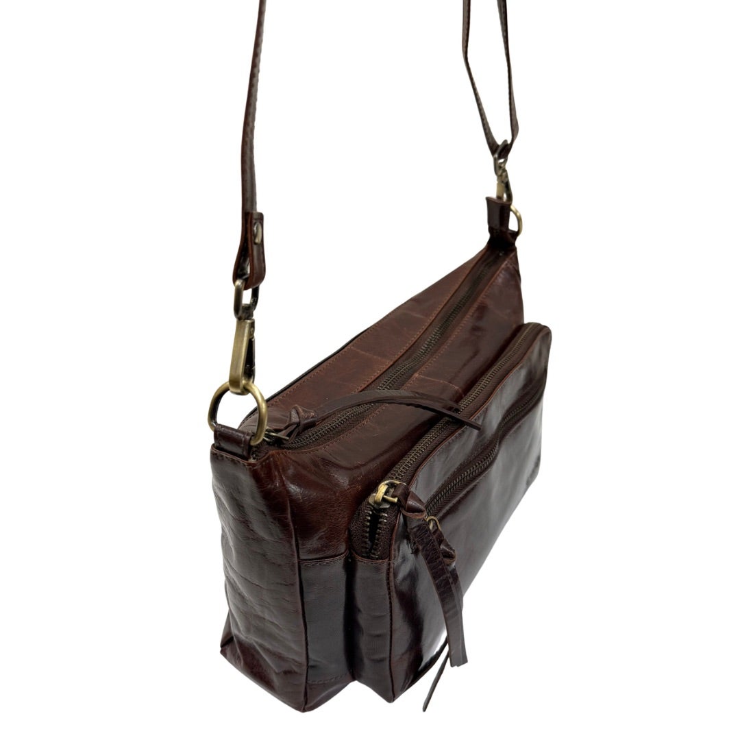Laadukas nahkalaukku, jossa säädettävä ja irrotettava olkahihna. Laukussa on paljon taskuja: Kaksi taskua laukun etupuolella ja yksi takana. Laukku suljetaan vetoketjulla. Laukun sisällä korttikotelo, avainnauha, vetoketjutasku ja kaksi avointa pikkutaskua. Laukun koko n. 19x29x8cm