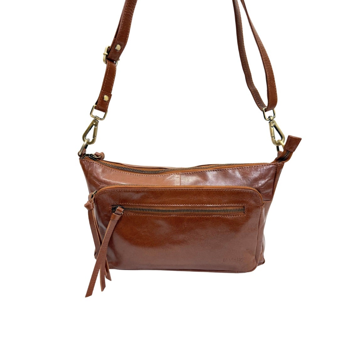 Laadukas nahkalaukku, jossa säädettävä ja irrotettava olkahihna. Laukussa on paljon taskuja: Kaksi taskua laukun etupuolella ja yksi takana. Laukku suljetaan vetoketjulla. Laukun sisällä korttikotelo, avainnauha, vetoketjutasku ja kaksi avointa pikkutaskua. Laukun koko n. 19x29x8cm