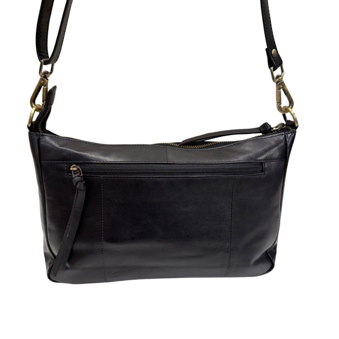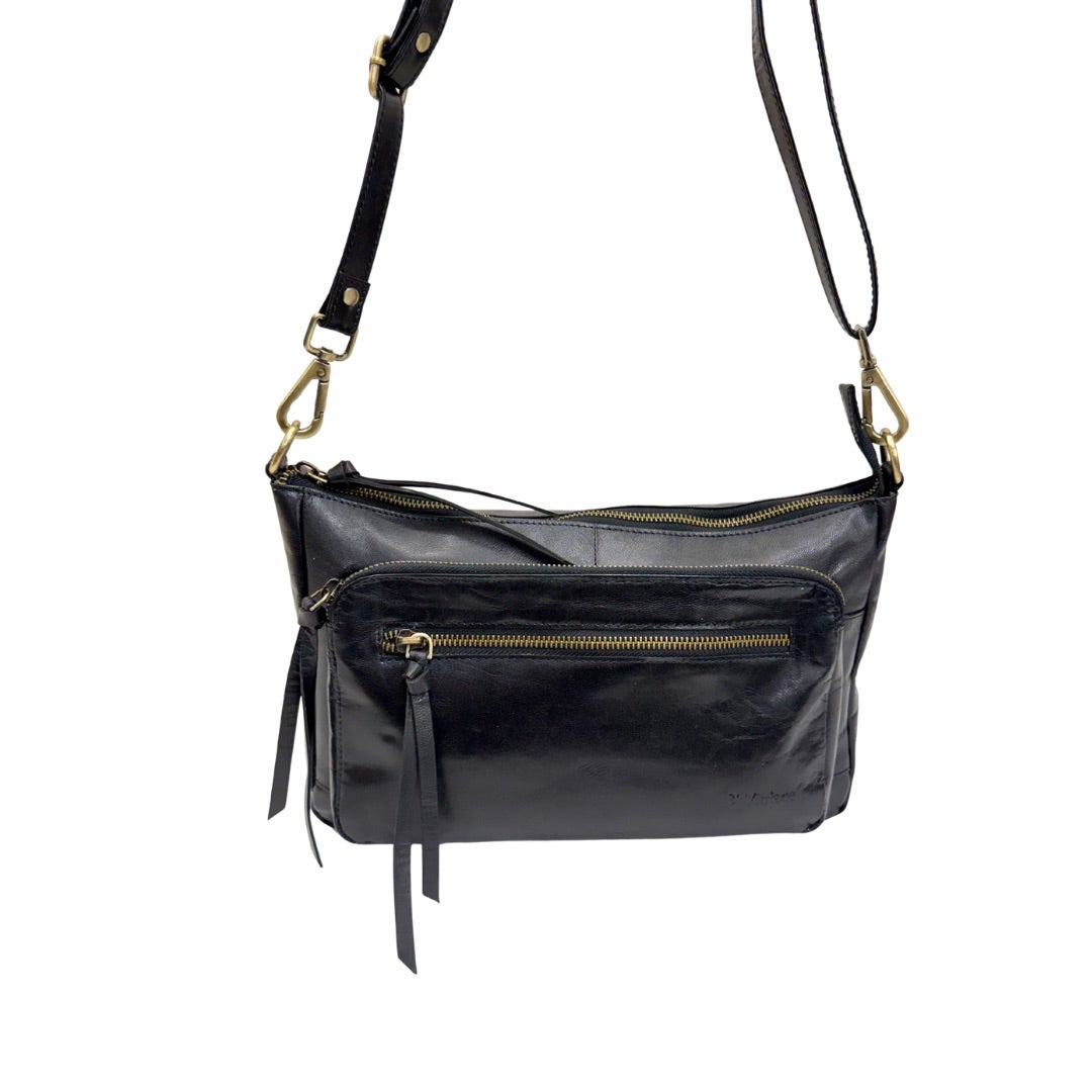 Laadukas nahkalaukku, jossa säädettävä ja irrotettava olkahihna. Laukussa on paljon taskuja: Kaksi taskua laukun etupuolella ja yksi takana. Laukku suljetaan vetoketjulla. Laukun sisällä korttikotelo, avainnauha, vetoketjutasku ja kaksi avointa pikkutaskua. Laukun koko n. 19x29x8cm