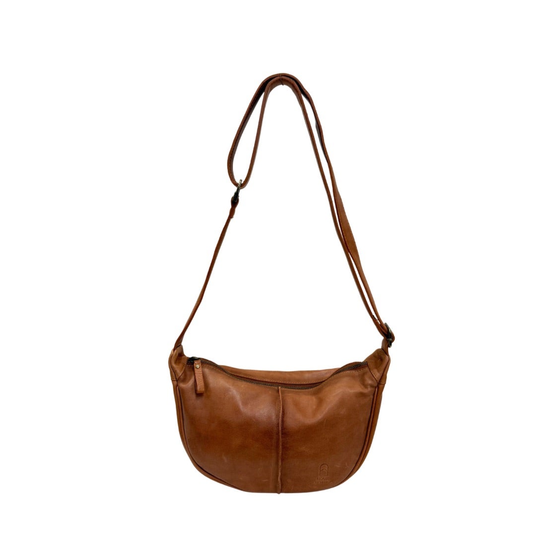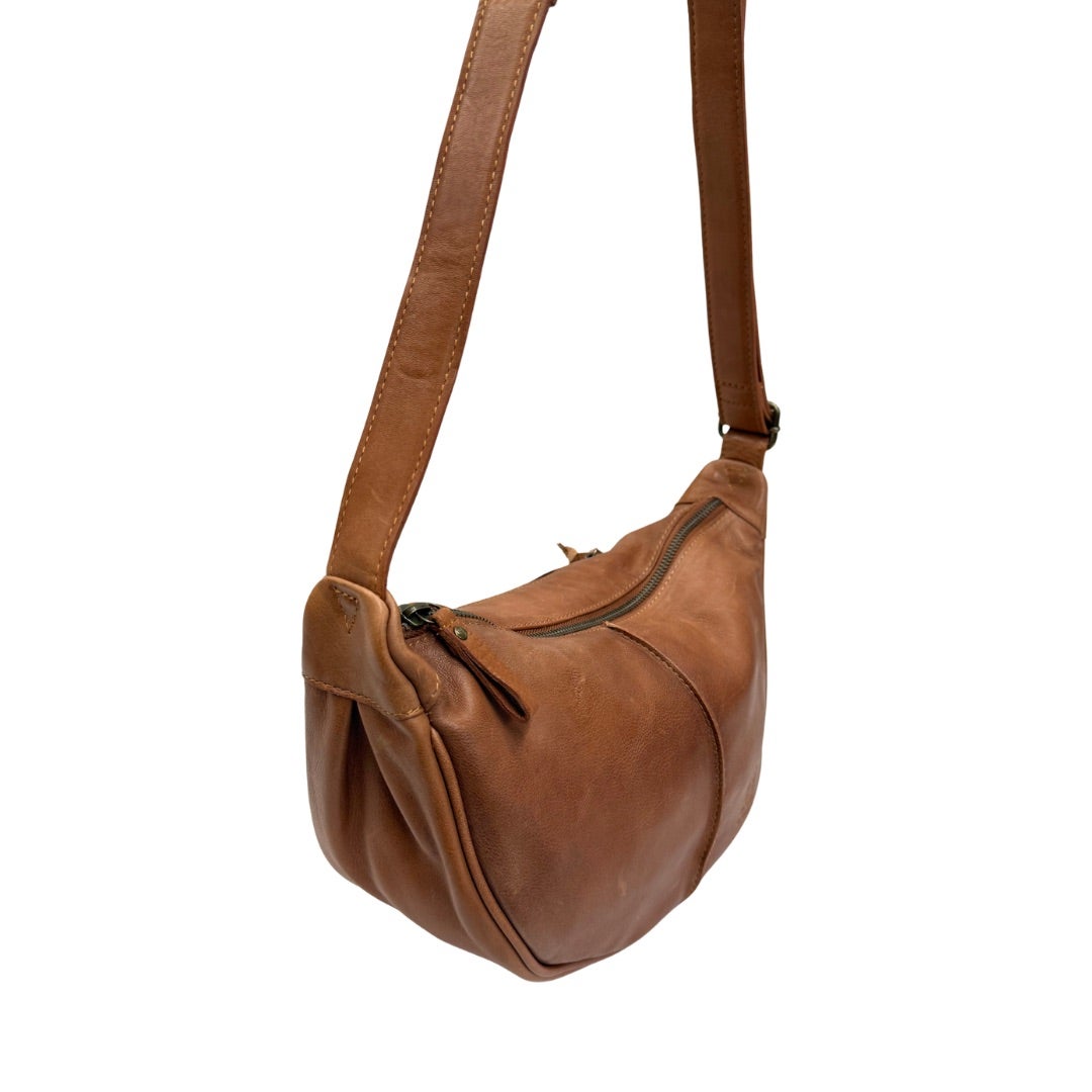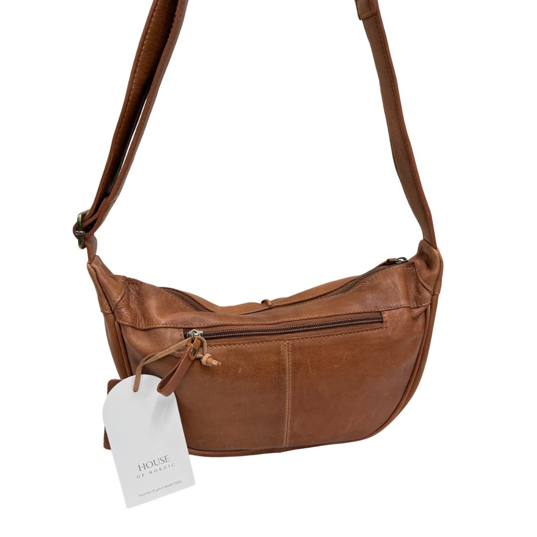 Laadukas veneenmallinen nahkalaukku, pehmeää nahkaa. Säädettävä olkahihna. Laukun takapuolella vetoketjutasku. Laukku suljetaan vetoketjulla ja laukun sisältä löytyy vetoketjutasku ja kaksi avointa pikku taskua. Laukun koko n. 19x30x10cm