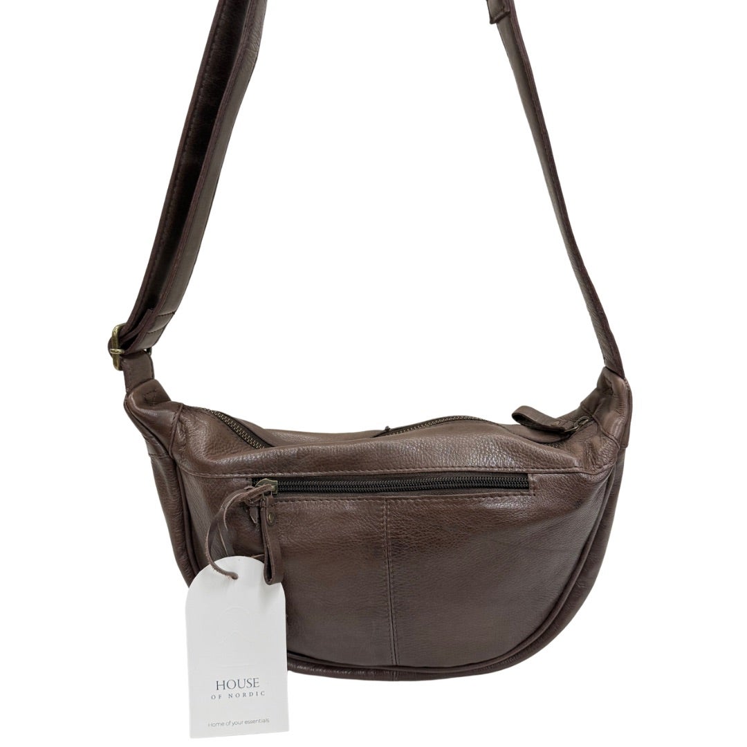Laadukas veneenmallinen nahkalaukku, pehmeää nahkaa. Säädettävä olkahihna. Laukun takapuolella vetoketjutasku. Laukku suljetaan vetoketjulla ja laukun sisältä löytyy vetoketjutasku ja kaksi avointa pikku taskua. Laukun koko n. 19x30x10cm
