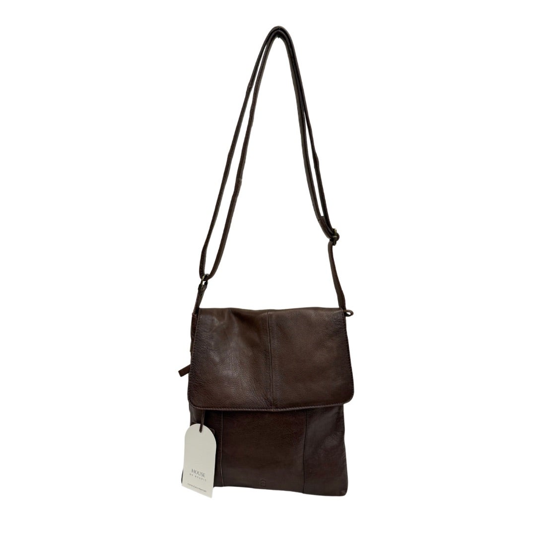 Läpällinen olkalaukku pehmeää aitoa nahkaa. Portaattomasti säädettävä olkahihna. Laukun takana vetoketjutasku. Laukku suljetaan vetoketjulla ja laukun sisällä vetoketjutasku ja kaksi avointa pientä taskua.