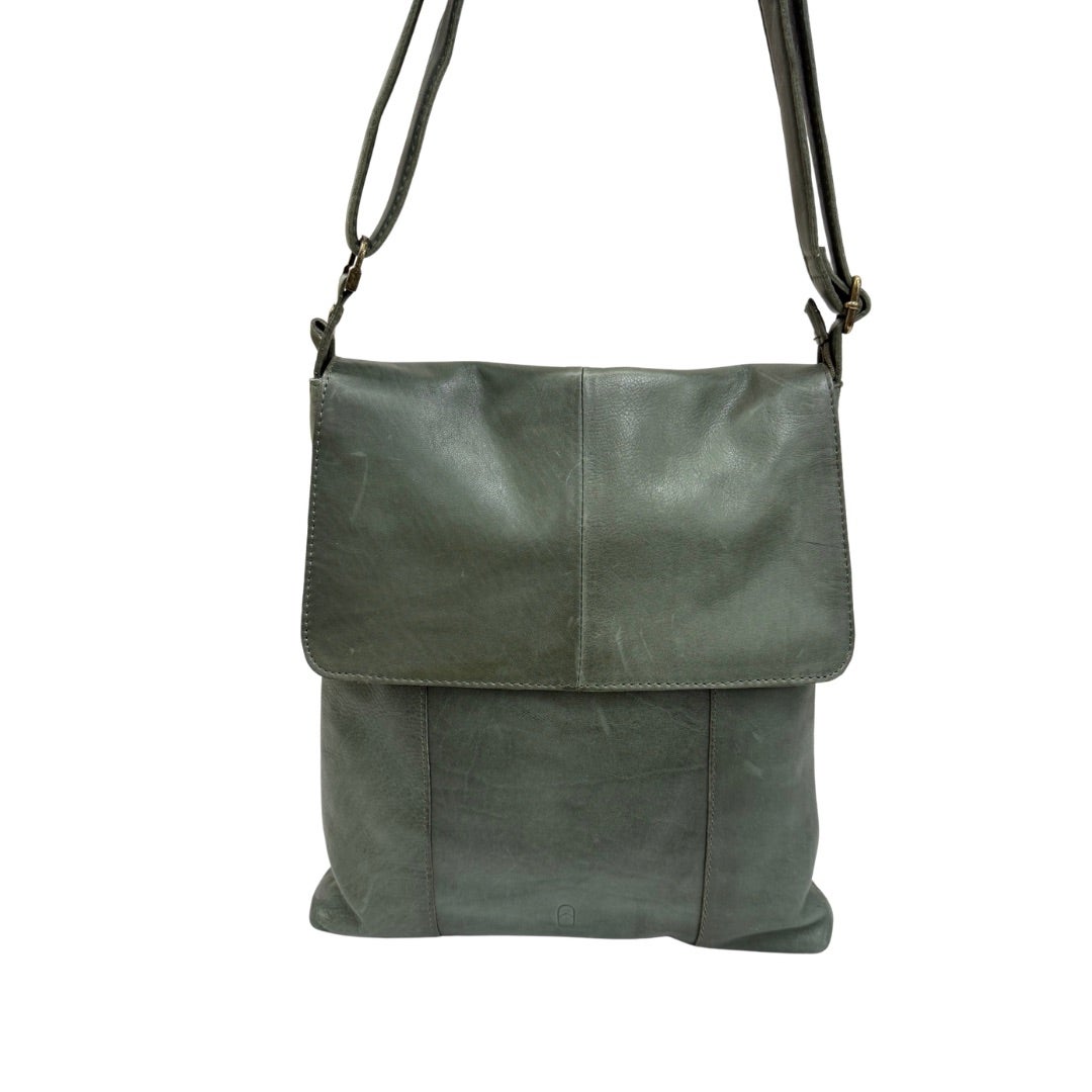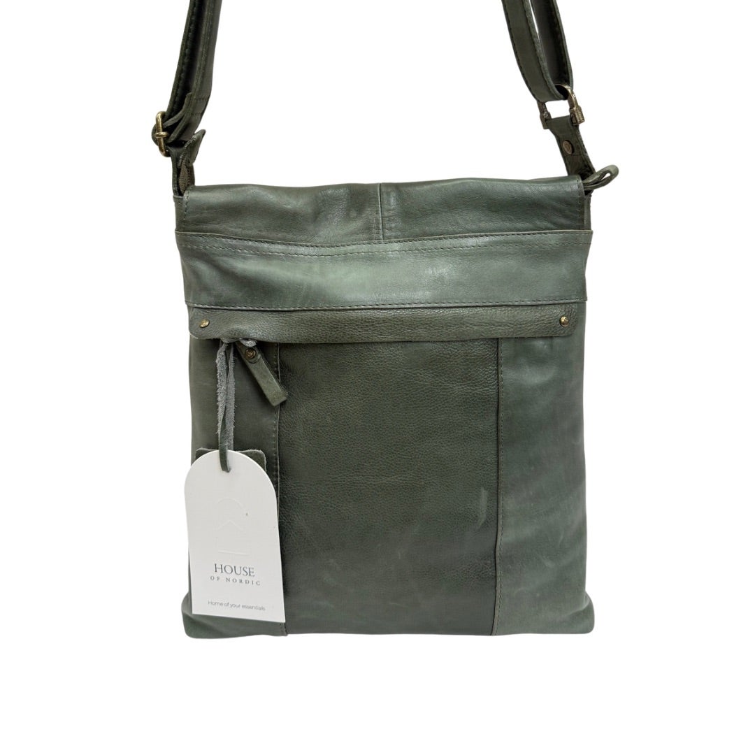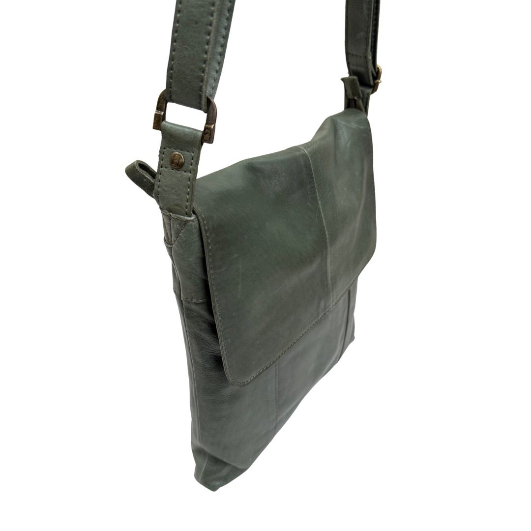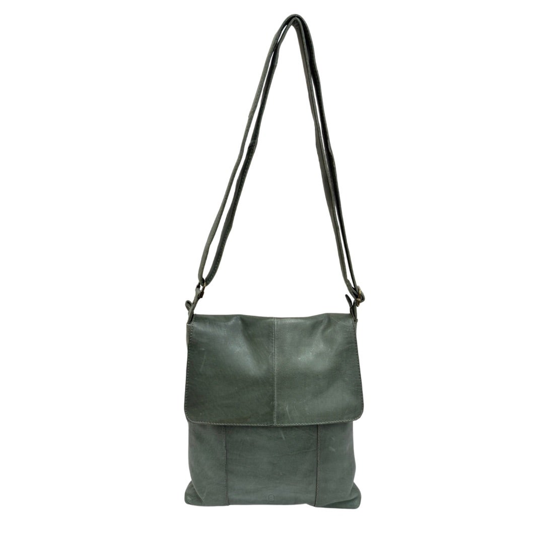 Läpällinen olkalaukku pehmeää aitoa nahkaa. Portaattomasti säädettävä olkahihna. Laukun takana vetoketjutasku. Laukku suljetaan vetoketjulla ja laukun sisällä vetoketjutasku ja kaksi avointa pientä taskua.