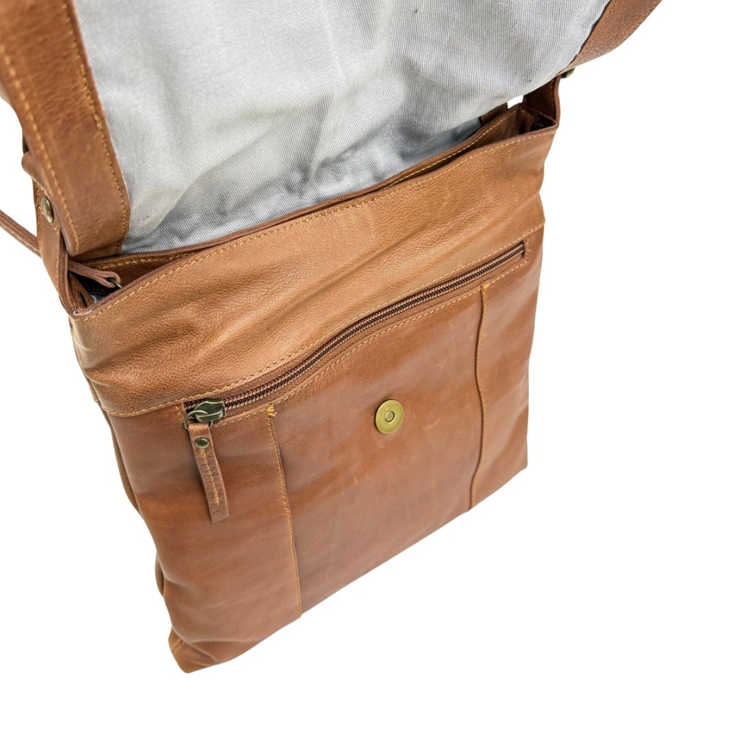 Läpällinen olkalaukku pehmeää aitoa nahkaa. Portaattomasti säädettävä olkahihna. Laukun takana vetoketjutasku. Laukku suljetaan vetoketjulla ja laukun sisällä vetoketjutasku ja kaksi avointa pientä taskua.