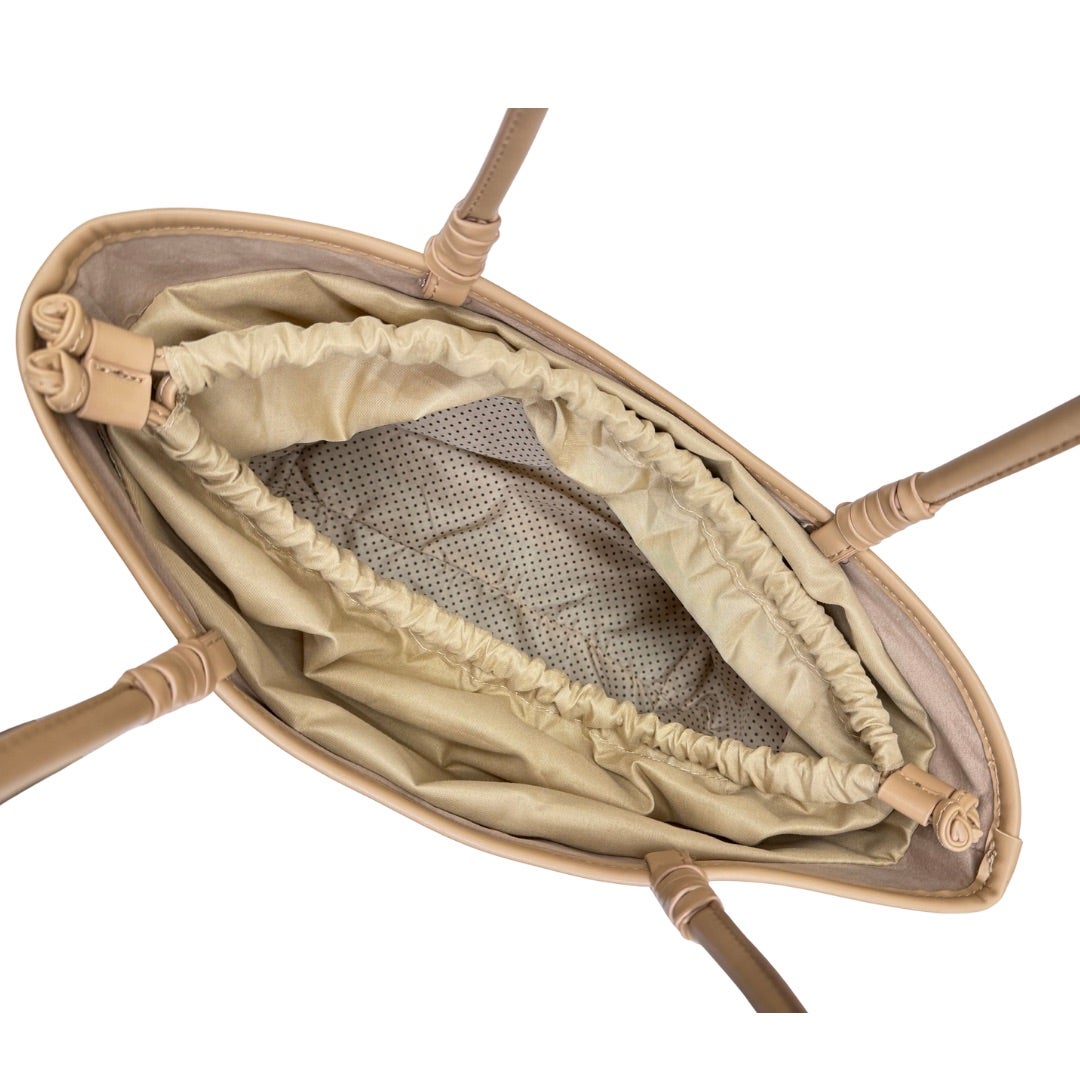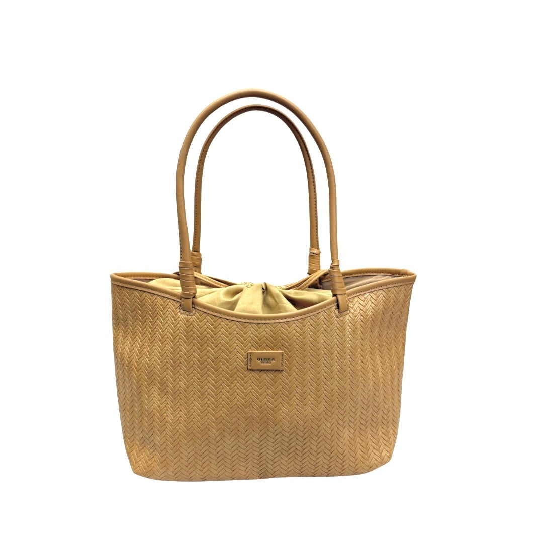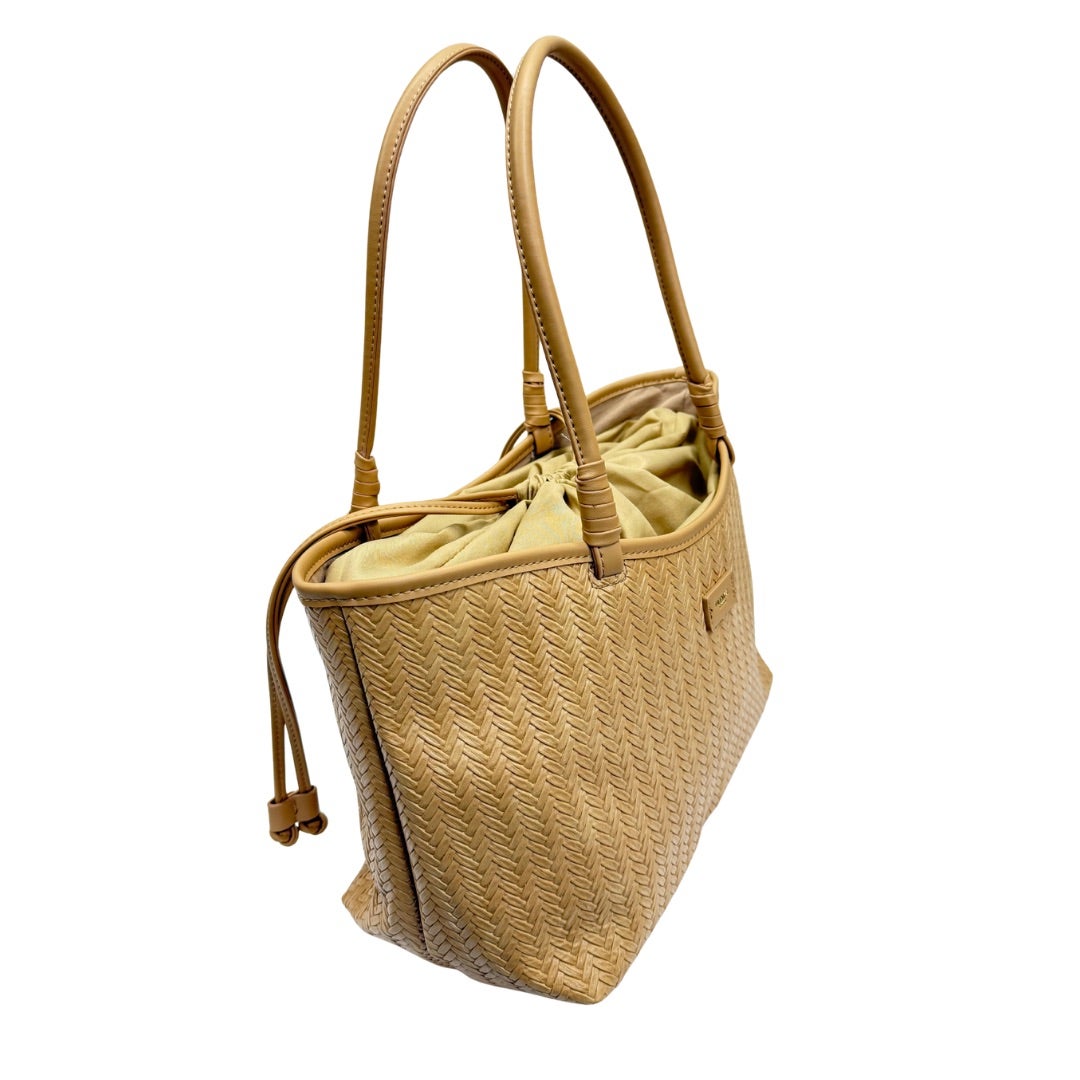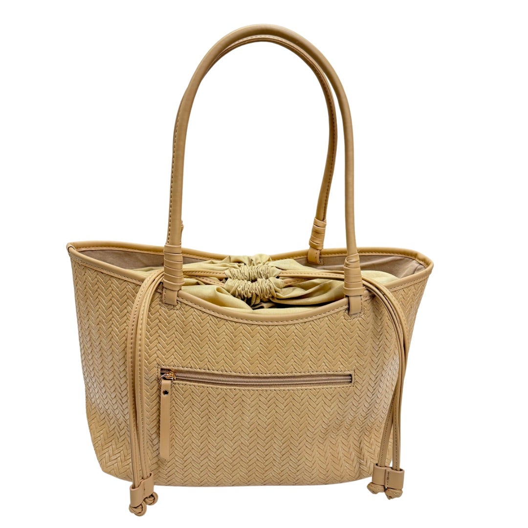 Keinonahkalaukku, jossa punosta jäljittelevä kohokuviointi laukun pinnassa. Kaksi kiinteää kantokahvaa ja ulkopuolella vetoketjutasku. Laukku suljetaan keinonahkaisilla kiristysnauhoilla vetämällä ja laukun sisällä vetoketjutasku ja kaksi avointa taskua. Koko n. 22x34x18cm