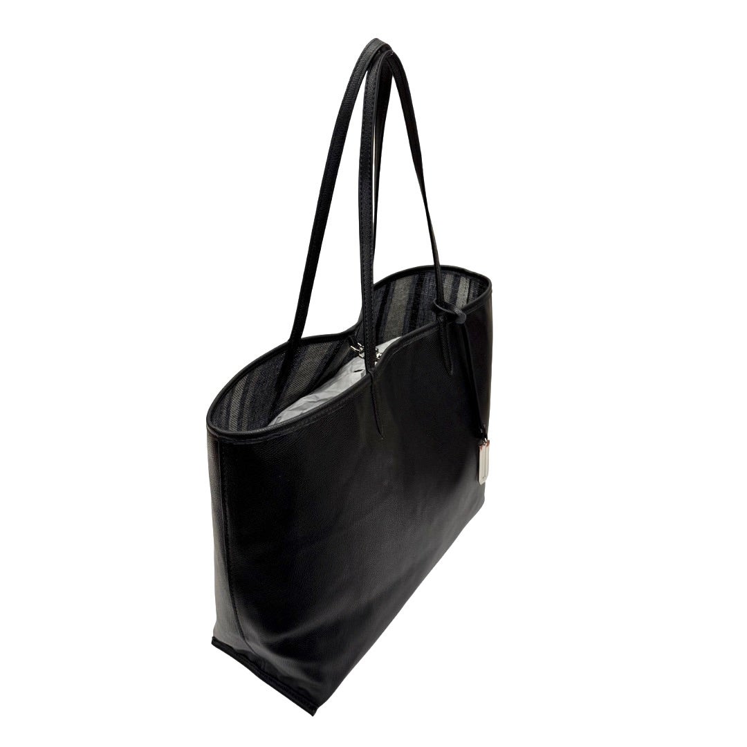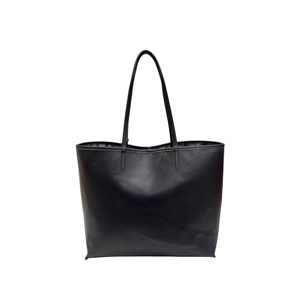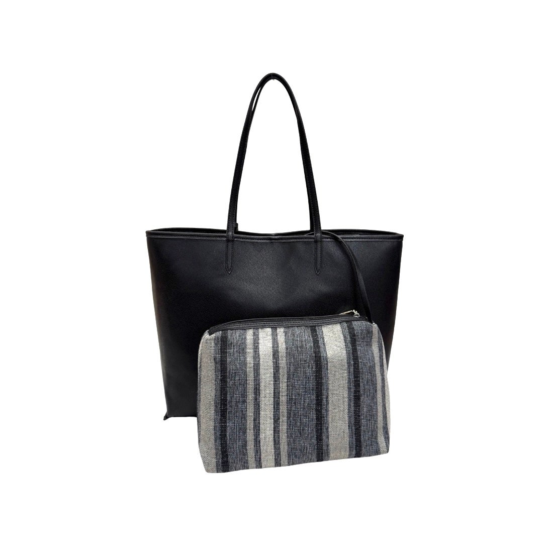 Keinonahkalaukku, joka on käännettävissä. Toinen puoli täysin musta ja toisella puolella raitakuvio. Toinen puoli keinonahkaa ja raidallinen puoli kanvasta. Avonainen, vuoreton malli. Keskellä hakanen, jolla laukun saa pysymään nätisti kiinni. Kiinteät kantokahvat. Laukun mukana sisäpusukka. Laukun koko n. 34x39x15