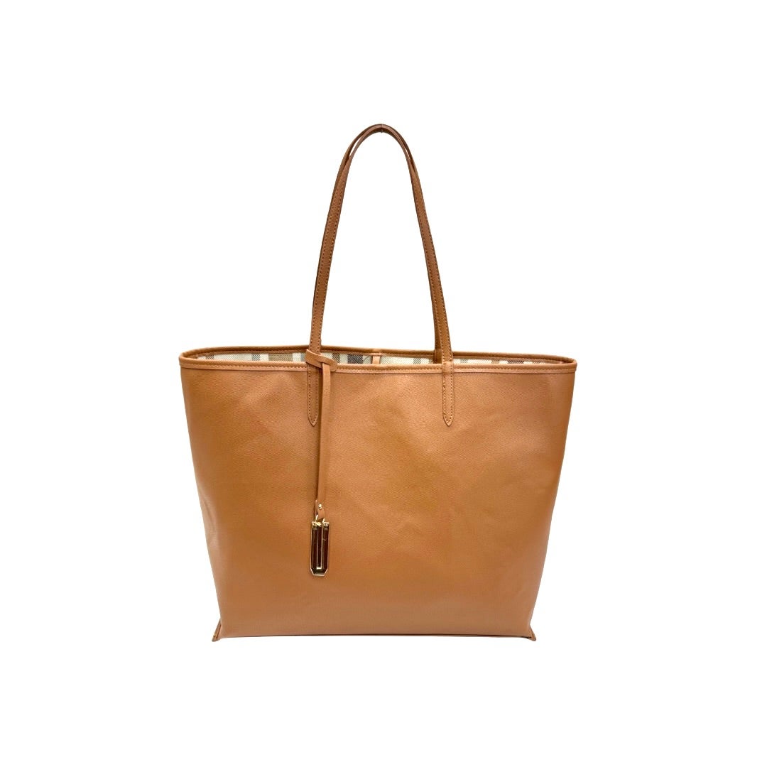 Keinonahkalaukku, joka on käännettävissä. Toinen puoli täysin musta ja toisella puolella raitakuvio. Toinen puoli keinonahkaa ja raidallinen puoli kanvasta. Avonainen, vuoreton malli. Keskellä hakanen, jolla laukun saa pysymään nätisti kiinni. Kiinteät kantokahvat. Laukun mukana sisäpusukka. Laukun koko n. 34x39x15