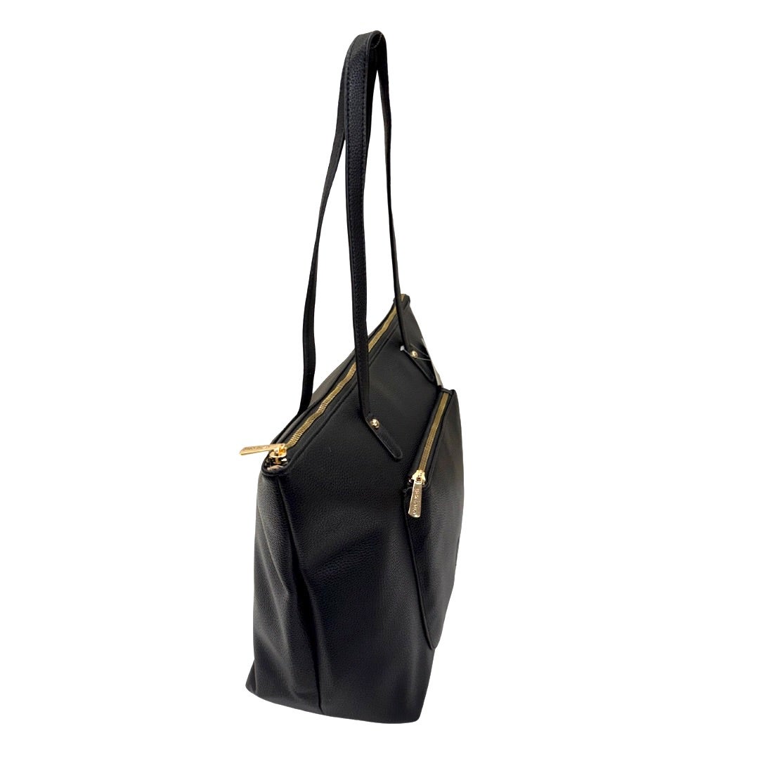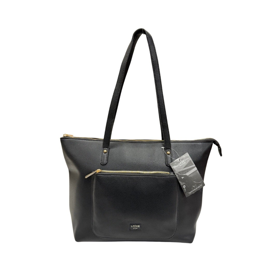 Iso keinonahkalaukku Lyckeltä. Laukussa etu- ja takapuolella vetoketjutaskut. Laukku suljetaan vetoketjulla ja sisällä laukussa vetoketjutasku ja kaksi avointa taskua. Laukun koko n. 28x41-31x14cm