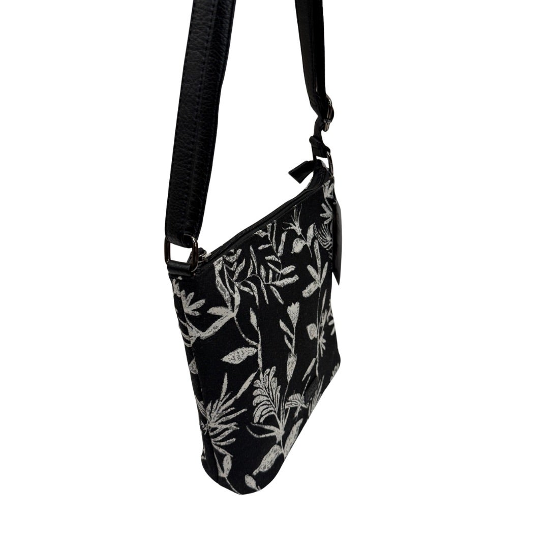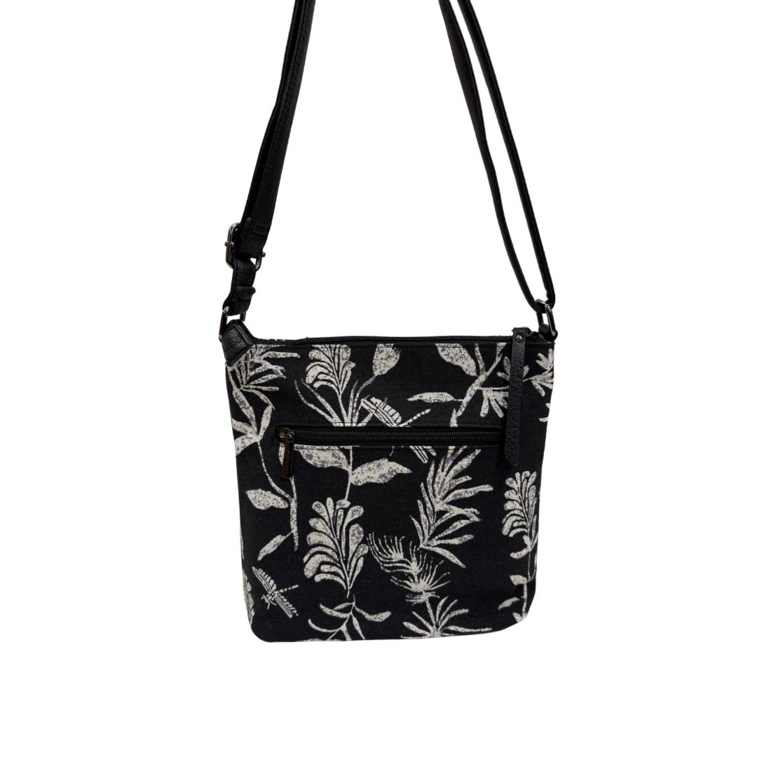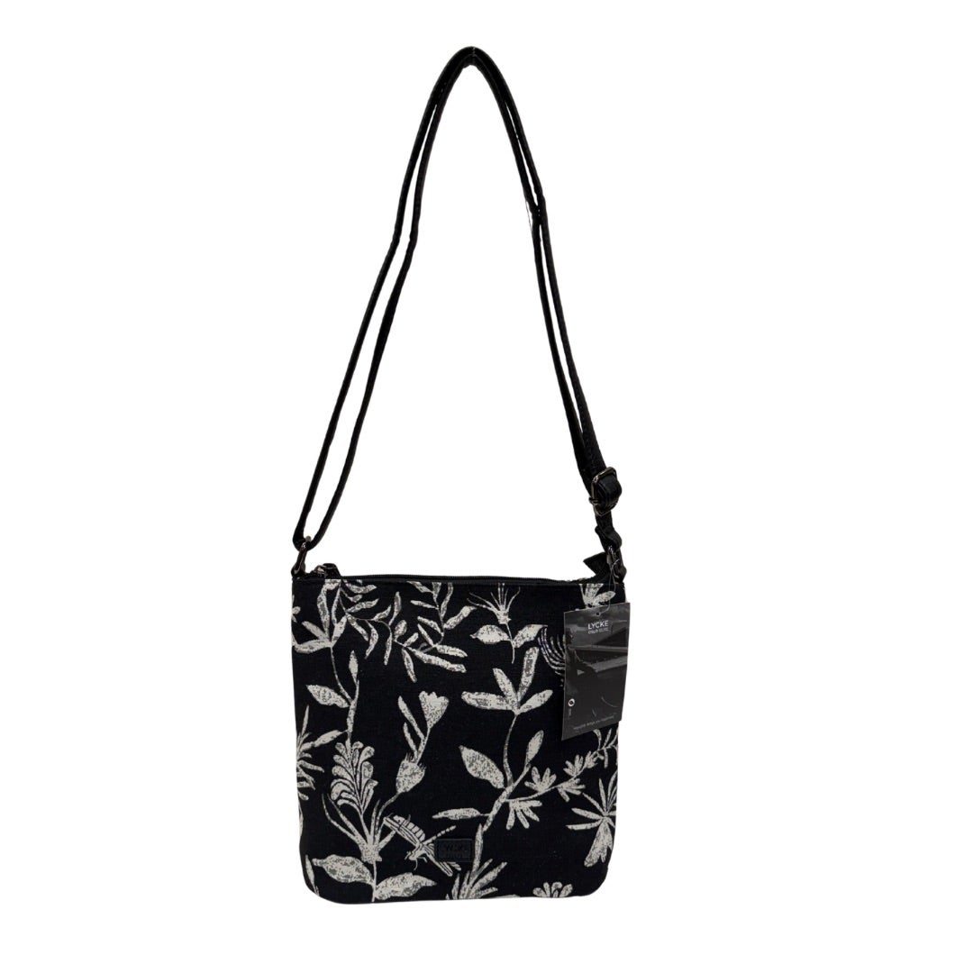 Olkalaukku upealla kuosilla, materiaali kanvasta. Laukun takapuolella vetoketjutasku. Laukku suljetaan vetoketjulla ja sisällä laukussa vetoketjutasku ja kaksi avointa taskua. Laukun koko n. 26x26x8cm