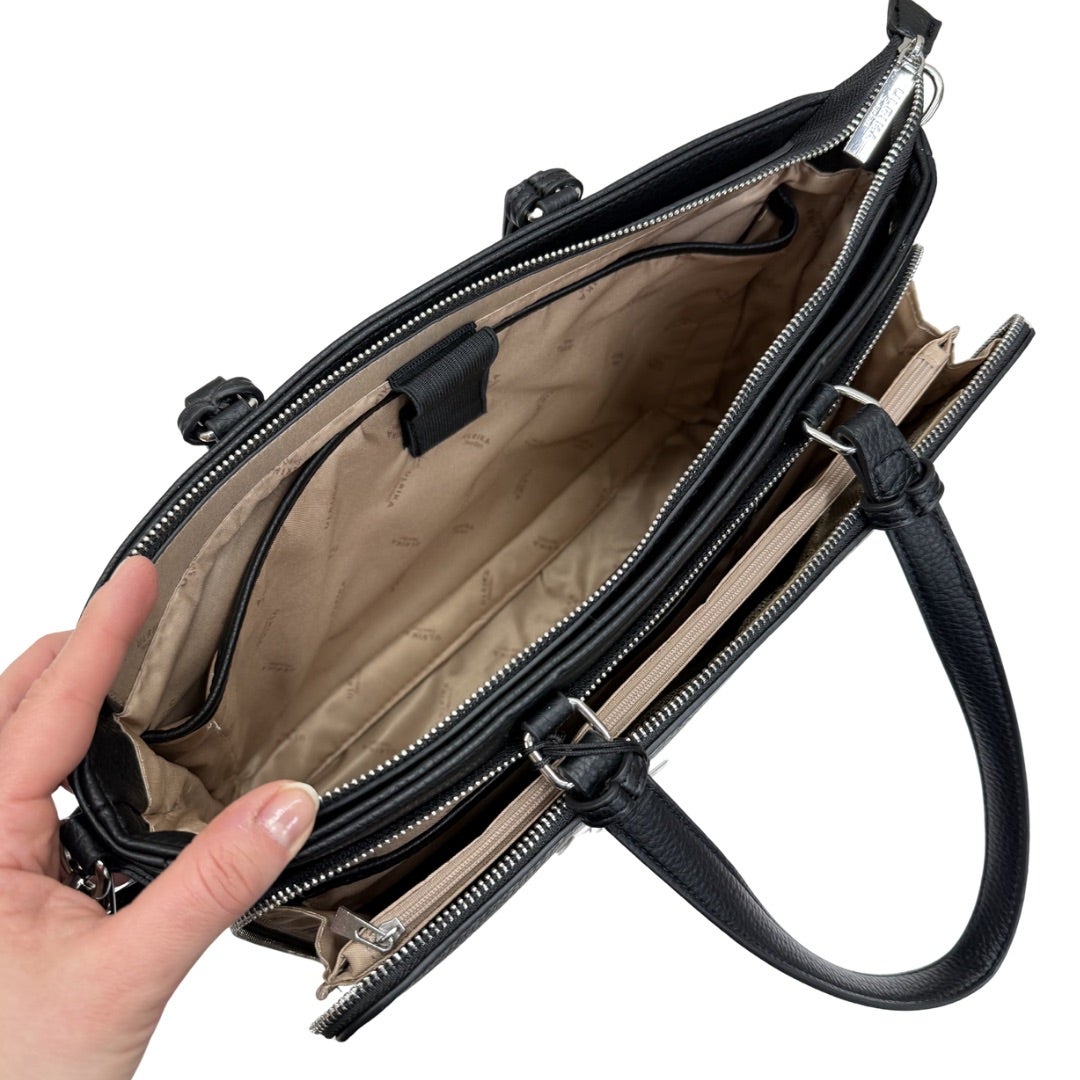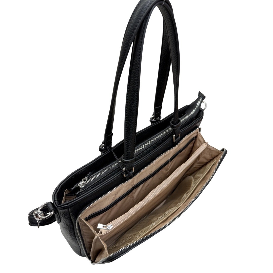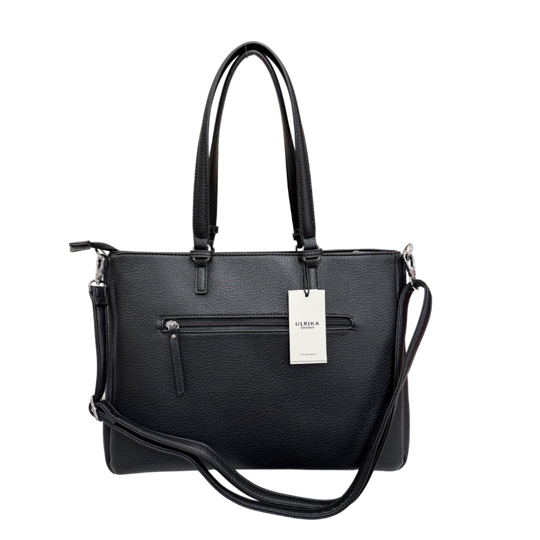 Täydellinen laukku työkaveriksi! Laukussa on oma tasku 14" tuuman läppärille, käytännöllisiä taskuja ja erillinen etutasku, jossa monta eri taskua tärkeille tarvikkeille ja papereille. Laukussa kiinteät kantokahvat sekä irroitettava ja portaattomasti säädettävä olkahihna. Laukun koko n. 40x28x11cm