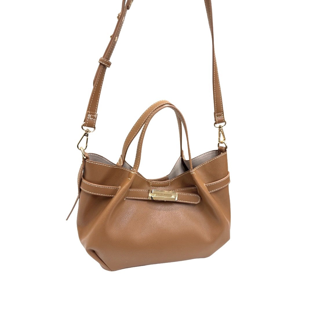 Tyylikäs keinonahkalaukku, jossa solkikoriste edessä. Laukussa kaksi kantokahvaa sekä irrotettava ja säädettävä olkahihna. Laukku suljetaan magneetilla. Vuoreton malli. Sisällä vetoketjullinen sisäpussukka. Laukun koko n. 18x33x13cm