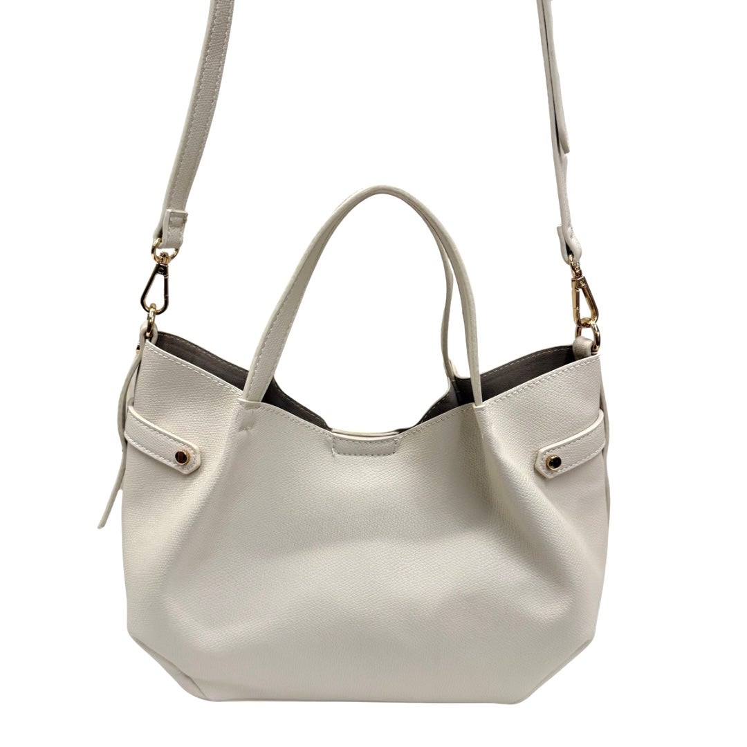 Tyylikäs keinonahkalaukku, jossa solkikoriste edessä. Laukussa kaksi kantokahvaa sekä irrotettava ja säädettävä olkahihna. Laukku suljetaan magneetilla. Vuoreton malli. Sisällä vetoketjullinen sisäpussukka. Laukun koko n. 18x33x13cm