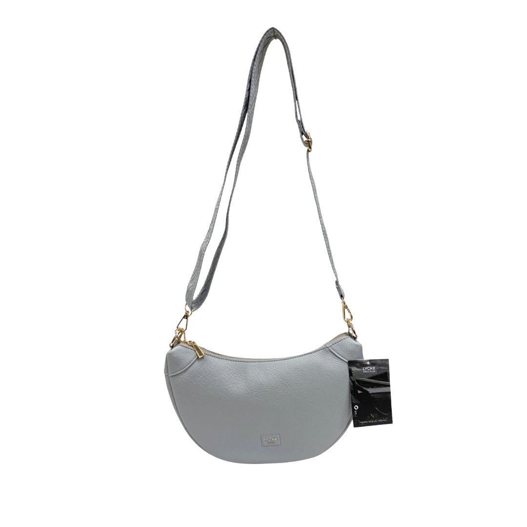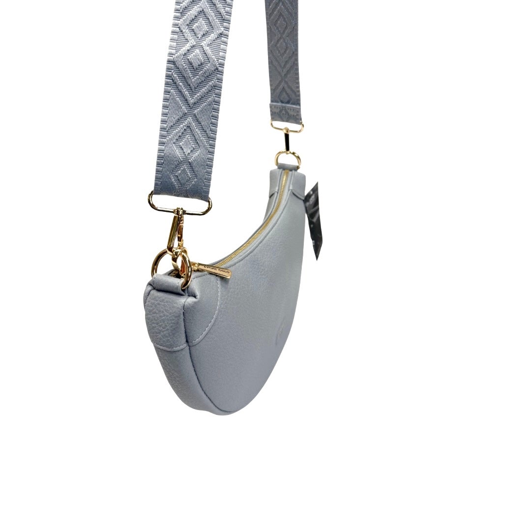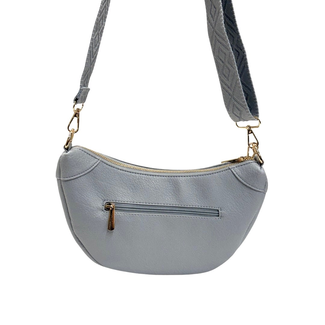 Kaunis keinonahkainen olkalaukku, jossa mukana kaksi erilaista hihnaa: perinteinen keinonahkainen sekä leveämpi canvasta. Kullanväriset metalliosat. Ulkopuolella vetoketjutasku. Laukku suljetaan vetoketjulla. Laukun sisällä vaalea vuori, vetoketjutasku sekä avoin tasku. Laukun koko n. 17x30x5cm