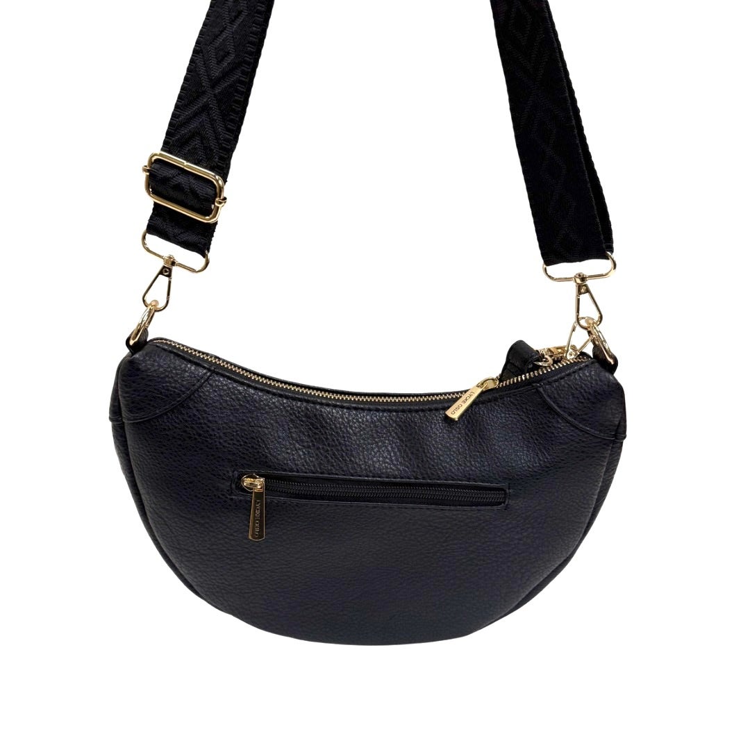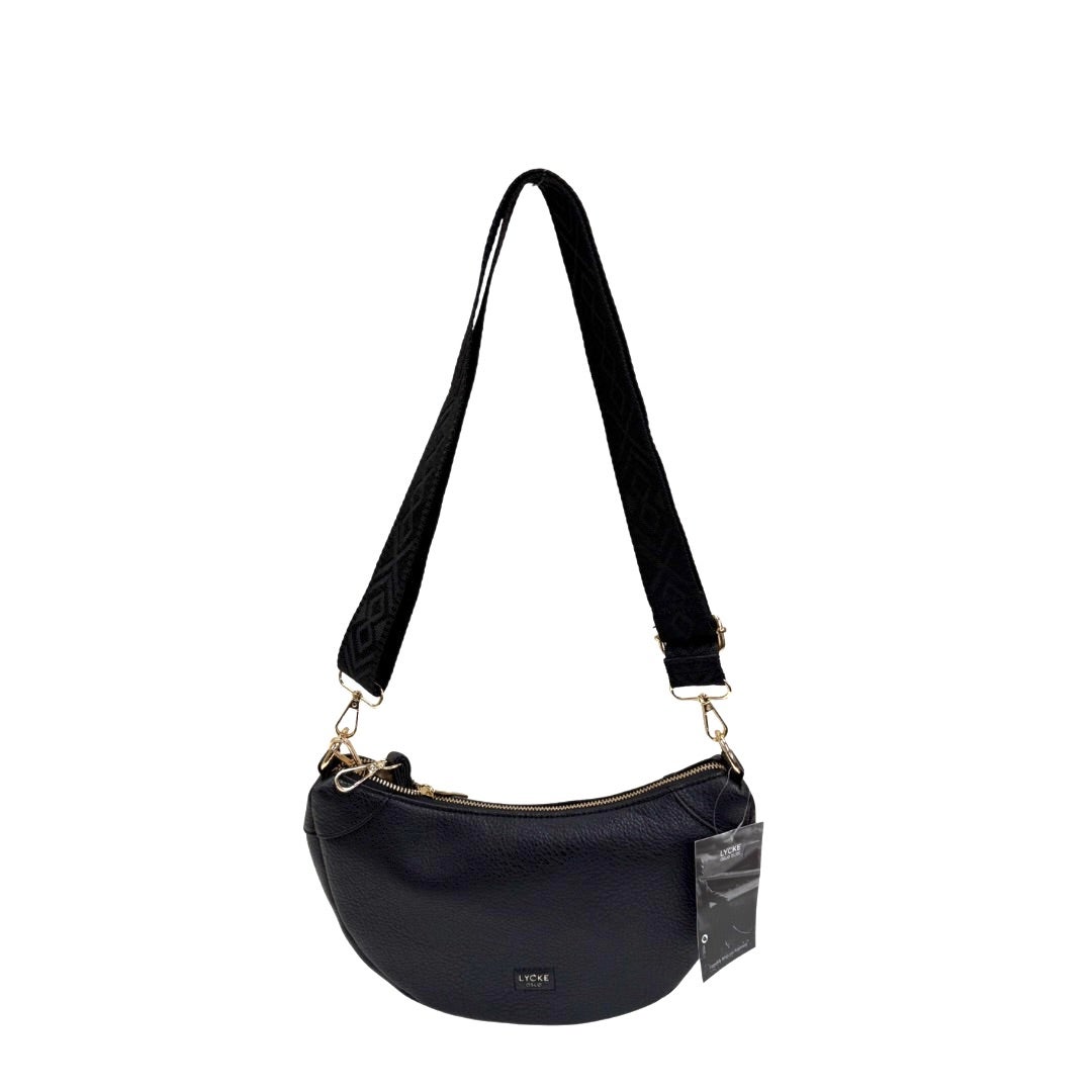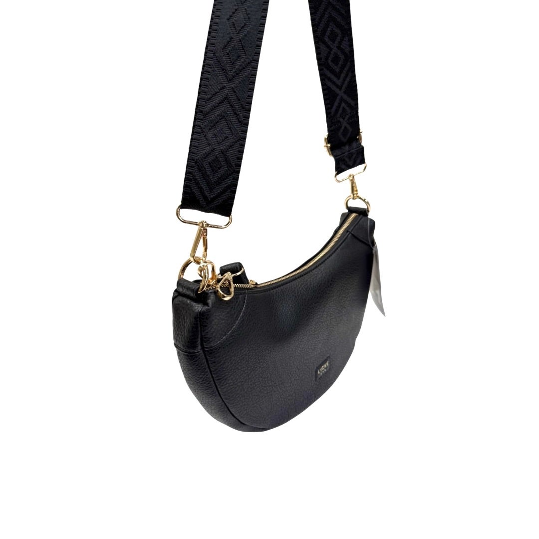 Kaunis keinonahkainen olkalaukku, jossa mukana kaksi erilaista hihnaa: perinteinen keinonahkainen sekä leveämpi canvasta. Kullanväriset metalliosat. Ulkopuolella vetoketjutasku. Laukku suljetaan vetoketjulla. Laukun sisällä vaalea vuori, vetoketjutasku sekä avoin tasku. Laukun koko n. 17x30x5cm