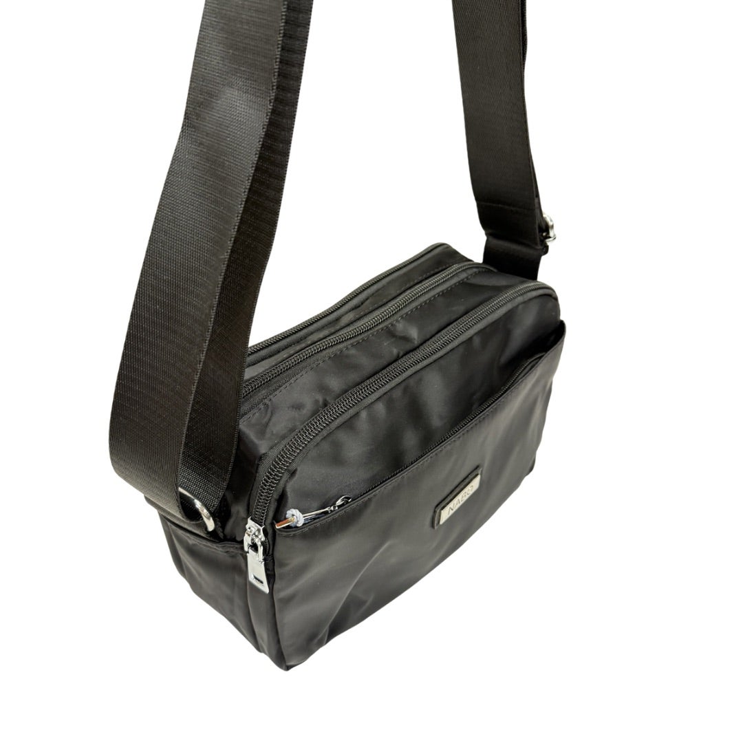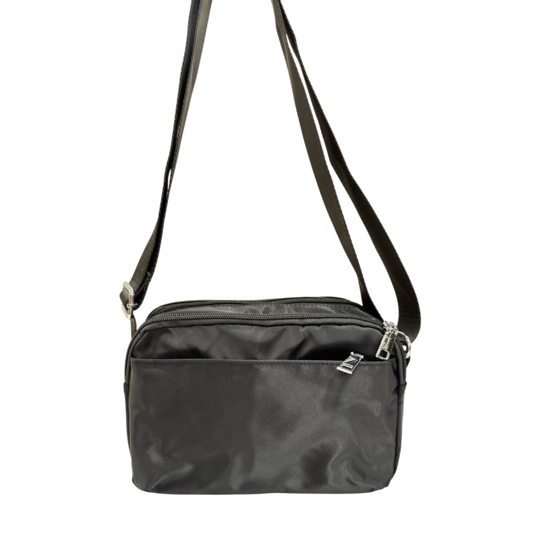 Upea kangaslaukku Nabolta, jossa kiiltäväpintainen kangas, joka helppo pyyhkiä puhtaaksi. Monta taskua Laukun ulkopuolella yhteensä viisi vetoketjutaskua. Sisäpuolella kaksi avointa taskua ja yksi vetoketjutasku. Pitkä olkahihna minimipituus n. 70cm ja maksimipituus 134cm
